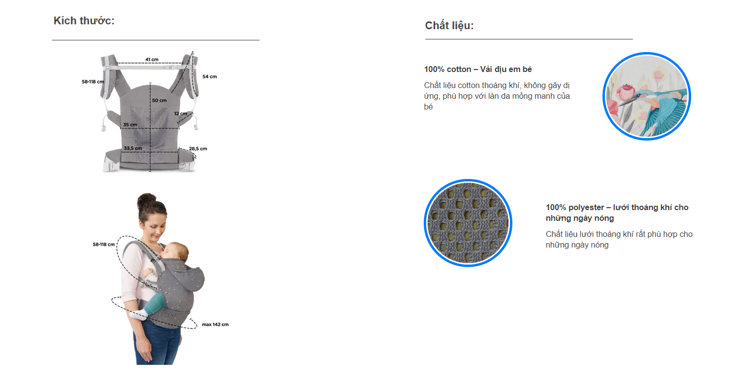 - Chiều rộng của địu có thể điều chỉnh cho phù hợp với bé