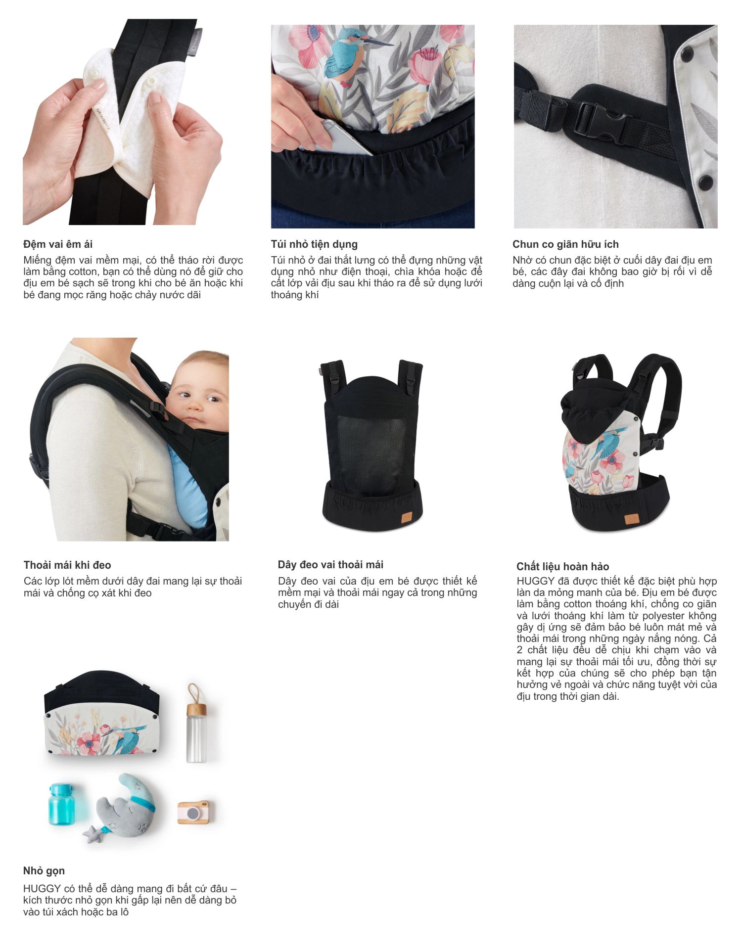 - Địu em bé tiện dụng đảm bảo sự thoải mái cho cả Cha Mẹ và con cái. Địu mang đến sự gần gũi mà bé cần, đảm bảo vị trí tối ưu và hỗ trợ sự phát triển lành mạnh của trẻ. Chiều rộng địu có thể điều chỉnh phù hợp với cả những em bé nhỏ nhất và các đai điều chỉnh dễ dàng (6 điểm) là một điểm cộng. Bạn sẽ thấy HUGGY tuyệt vời cả khi ở nhà hay khi đi dạo trong bất kỳ thời tiết nào, vì nó trang bị một mũ trùm đầu có thể tháo rời và lớp lưới thoáng khí cho những ngày nóng nực. Ngoài ra, nhờ lớp đệm vai bằng cotton mềm mại, địu em bé được làm sạch dễ dàng và nhanh chóng, đặc biệt khi địu bị bẩn trong khi cho ăn hoặc do trẻ nhỏ chảy nước dãi.