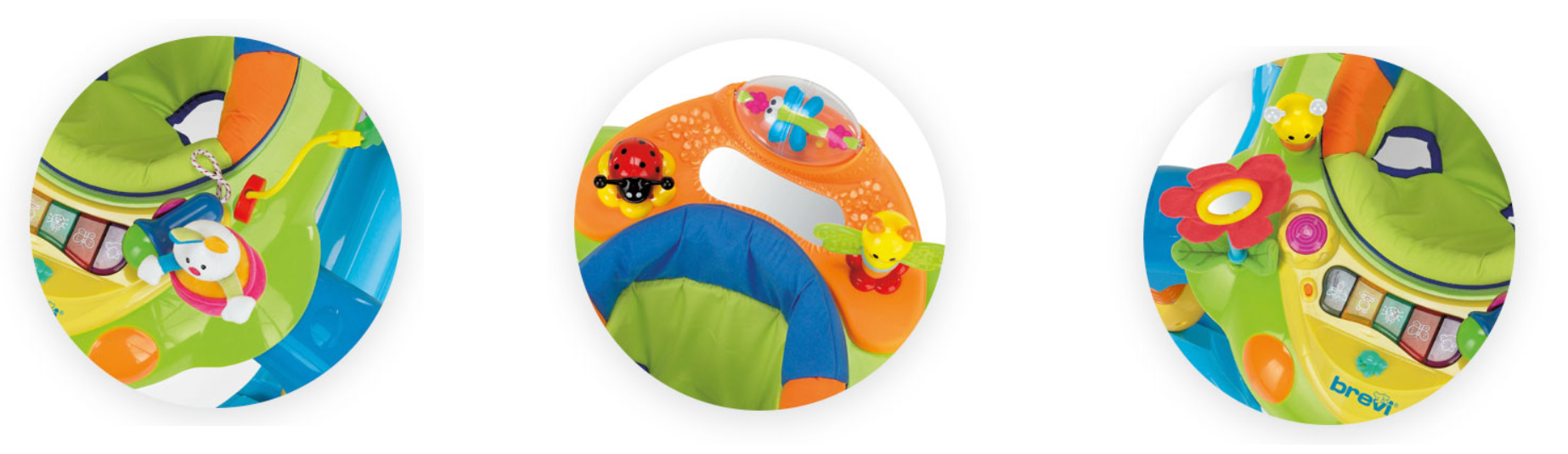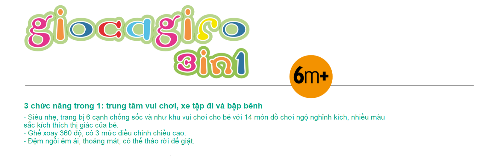 − Xe gồm 14 thiết bị giải trí vui nhộn kích thích mọi giác quan của bé, ghế ngồi có thể xoay được 360° giúp bé tiếp cận dễ dàng với vòng đồ chơi xung quanh.